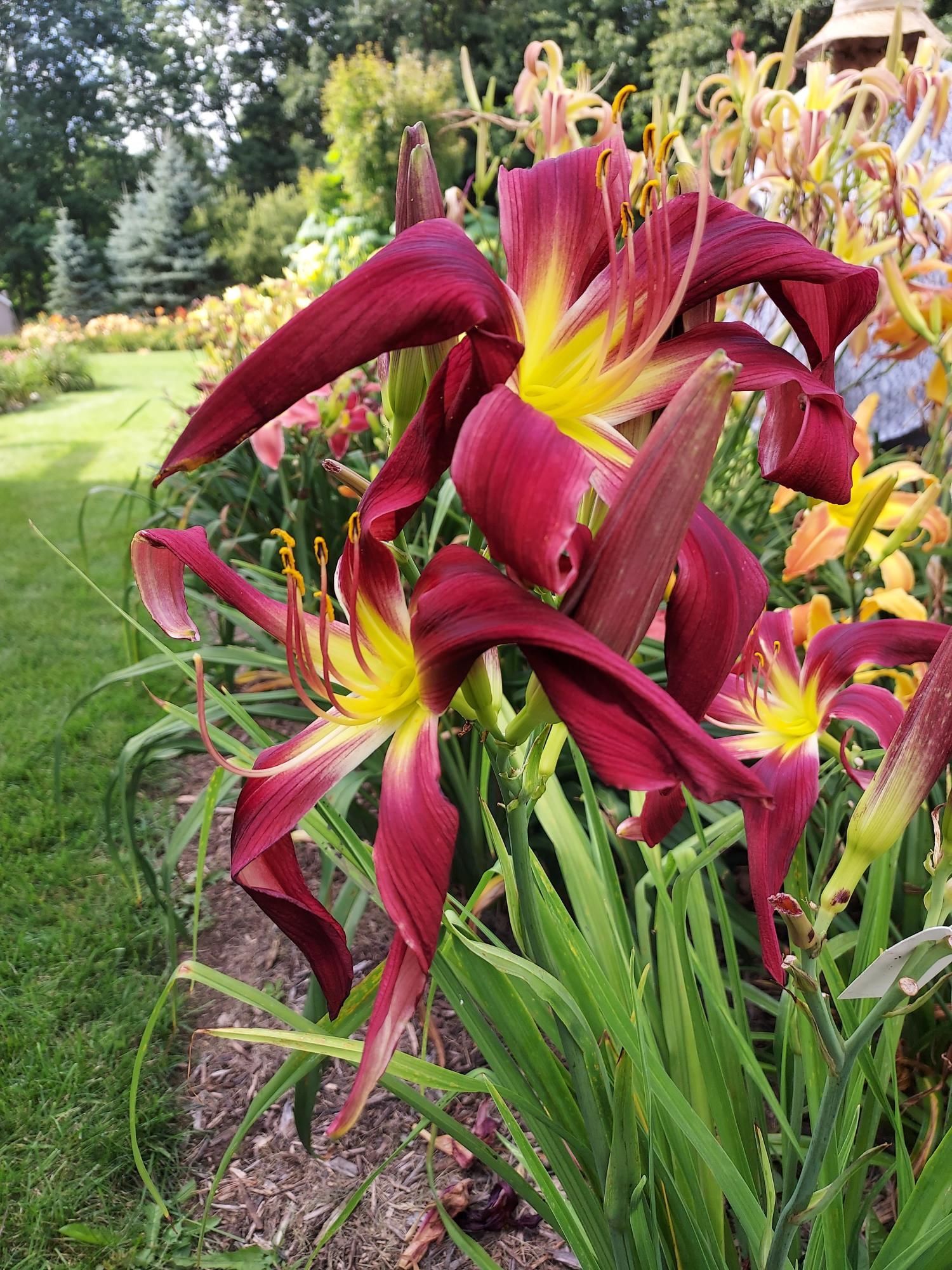 Sunfast dark red purple, small yellow to white throat, with twisted sepals and recurved petals. UF form that changes by the day. Pod parent, and extremely fertile pollen.